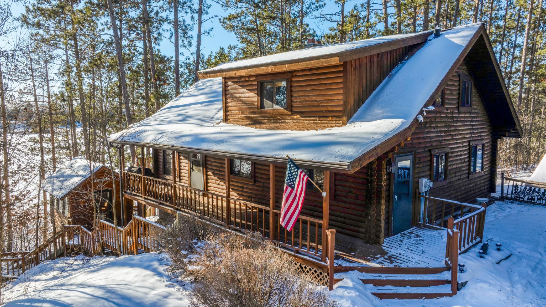 The lower level includes a walk-out leading to lake activities. Entertain with ease at the log bar and wood-burning fireplace, creating a warm, inviting atmosphere for chilly evenings. This level also includes additional bedrooms, a full bath, and a utility room.